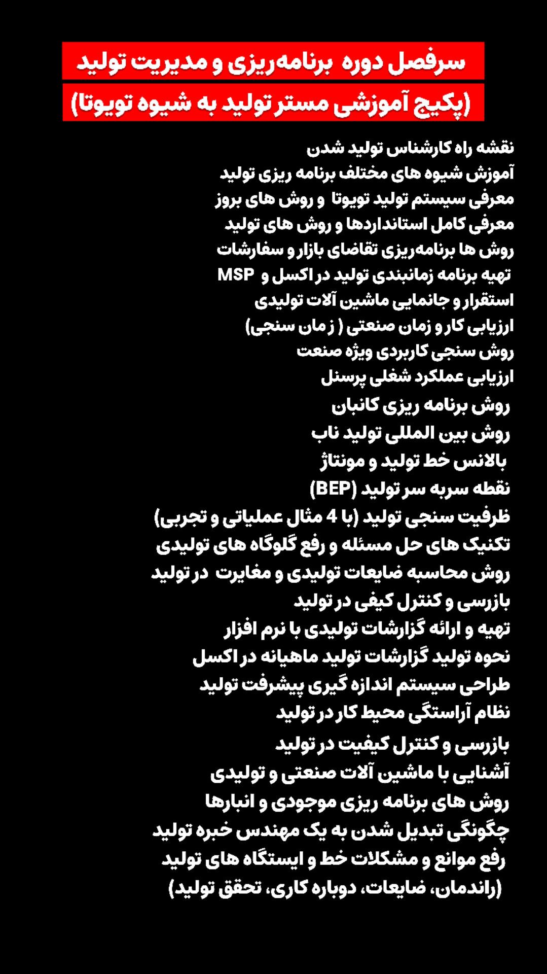 | مدرس دوره | مرتضی بهمنی - مشاور ،محقق و مدرس صنایع و صنعت برای اطلاعات بیشتر به قسمت درباره من یک سری بزنید و یا در پیج اینستا Bahmaniie.ir عضو شوید. یا برای دیدن ویدیوهای دوره به کانال تلگرام بپیوندید. Bahmaniie_ir |